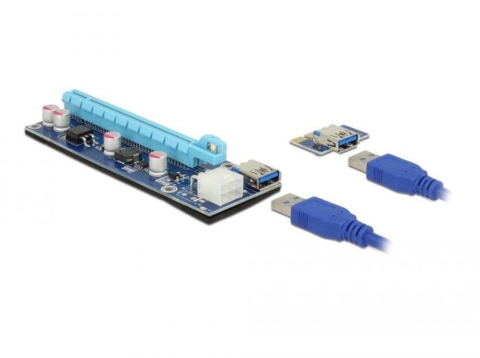 Egy PCIe x16 grafikus kártya használható PCIe x1 bővítőhelyeken!A Delock PCI Express bővítőkártya az alaplap PCI Express x1 bővítőhelyére csatlakoztatható. Ezután az x16 PCI Express bővítőhelyet a számítógép házon belül más helyre lehet szerelni. Ez lehetővé teszi egy grafikus kártya működtetését minden egyes alaplapi PCIe bővítőhelyről, akkor is, ha a grafikus kártya szélesebb, mint egy bővítőhely. Több bővítő kártya használatával több grafikus kártya is működtethető egyszerre egy alaplapon, például digitális fizetőeszközök bányászatához mint, Bitcoin, Ethereum vagy Zcash. A csomag tartalmaz egy 60 cm hosszú USB 3.0 bővítő kábelt. Ezen a kábelen nincs USB-jel, ezért nem lehet másik vagy hosszabb kábellel kicserélni.  Alaplapi oldal: 1 x PCI Express x1,  1 x USB 3.0 A-típusú hüvelyBővítő oldal: 1 x PCI Express x16, 1 x USB 3.0 A-típusú hüvely,  1 x 6 tűs PCIe tápkábel, anyaAkár 800 MB/s sebességű adatátvitel4 db FP szilárd kondenzátor biztosítja a grafikus kártya biztonságos tápellátását4 db rögzítő lyuk a bővítő kártyánAz alsó részen izolált, csúszásgátló párnaBővítő kártya mérete (H x Sz x M): kb. 128,25 x 43,50 x 21,20 mmOperációs rendszertől független, illesztőprogram telepítése nem szükséges A csomag tartalm: PCIe - USB bővítő kártya,  USB - PCIe bővítőkártya,  USB 3.0 kábel,  Tápkábel